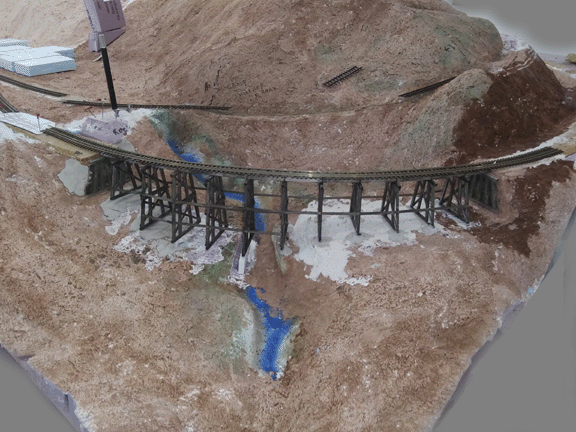 The model is scratch built and has over 250 pieces of custom cut scale basswood and nut/bolt details. The trestle has been set and operational. There are a few details yet to be added.
